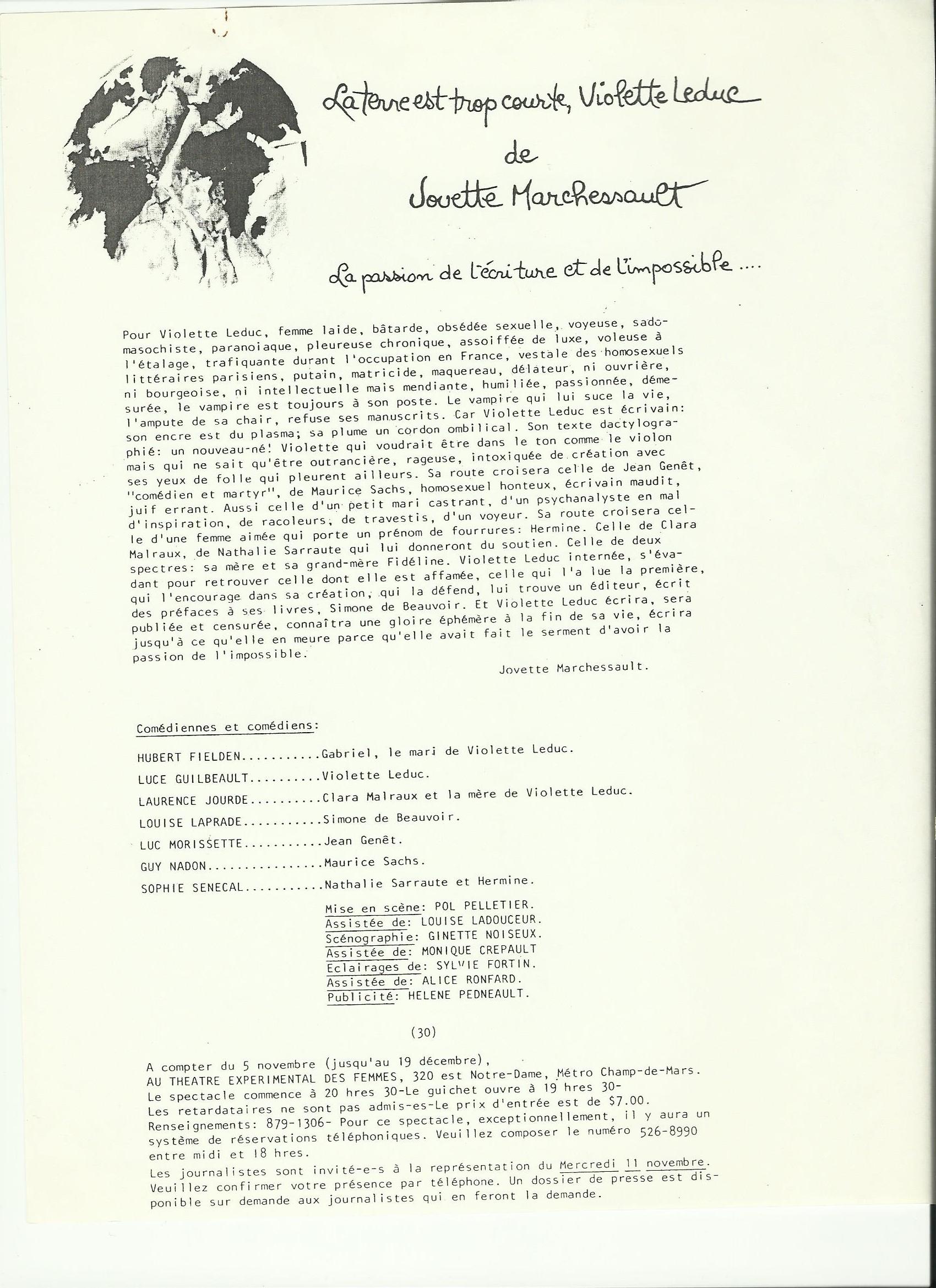 Personne dont le nom apparaît: Jovette MarchessaultSpectacle/événement référencé: La terre est trop courte, Violette LeducThéâtre référencé: Théâtre expérimental des femmes